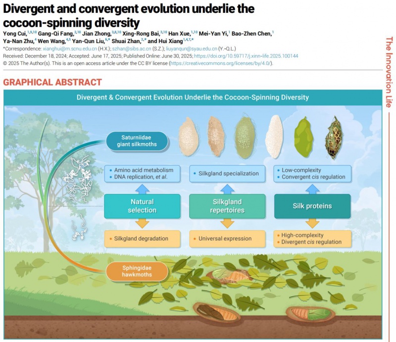 近日,江西农业大学动物生理生化研究团队青年教师崔勇,联合中国科学院分子植物科学卓越创新中心詹帅研究员、华南师范大学相辉研究员,在Cell旗下高水平综合期刊《The Innovation》的子刊《The Innovation Life》(创刊于2023年6月25日)在线发表了题为“Divergent and convergent evolution underlie the cocoon-spinning diversity”的研究成果。