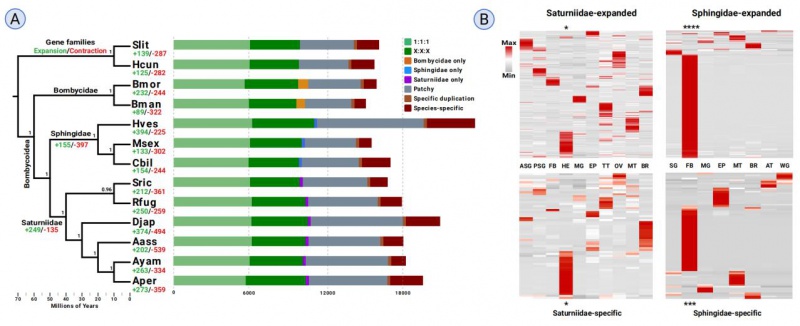 主要研究内容:(1)研究团队首先通过单拷贝直系同源基因重建了系统发育树,并在此基础上鉴定出两类关键基因家族:支系特异性存在的基因家族与支系特异性扩张的基因家族。这两类基因家族在“结大茧的大蚕蛾科”与“几乎不结茧的天蛾科”幼虫末期,表现出明显的组织表达偏好差异:大蚕蛾科的这类基因更偏好在血淋巴系统表达,推测可能参与泌丝阶段的物质运输与营养供给;天蛾科的这类基因则更倾向于在脂肪体中表达,推测可能与蛹期的营养储备过程相关。