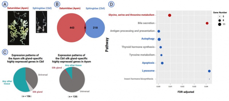 (2)系特异性正选择基因在这两个姐妹群中同样呈现显著分歧:大蚕蛾科的正选择基因显著富集于产丝相关通路,而天蛾科的正选择基因则未富集到任何产丝相关通路。随后,研究人员以大蚕蛾科代表物种(天蚕)和天蛾科代表物种(豆天蛾)为研究对象,分析二者的丝腺特异高表达基因发现:天蚕的丝腺特异高表达基因显著富集于氨基酸代谢等与产丝直接相关的通路;而豆天蛾的丝腺特异高表达基因则富集于自噬通路,推测可能与丝腺退化过程密切相关。此外,通过对比这类基因在两个姐妹群中的组织表达模式,研究还发现:结大茧的天蚕,其丝腺更倾向于招募组织特异性表达的基因;而不结茧的豆天蛾,其丝腺基因表达则以泛表达基因为主。