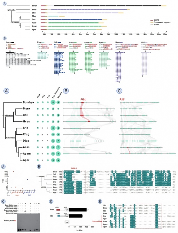 (3)茧丝的核心成分是丝纤维蛋白,研究发现蚕蛾总科代表物种的丝蛋白基因展现出丰富的多样性演化模式。具体表现为两点:一是除丝素重链基因(fib-H)外,其他丝蛋白基因均发生了丰富的基因丢失或重复事件;二是fib-H基因在结构特征与表达调控层面,呈现出“分歧与趋同并存”的演化特征 —— 结大茧的大蚕蛾科与不结茧的天蛾科存在明显分歧,反而与外群物种(家蚕)呈现一定的趋同演化。例如,大蚕蛾科物种的fib-H基因内含子更短,推测更利于实现高效转录;其FibH蛋白重复区域的氨基酸复杂度与重复单元整齐度,均显著低于天蛾科物种的FibH,而与家蚕FibH的特征高度相似;同时,大蚕蛾科FibH优势氨基酸的密码子偏好性及对应tRNA的比例,也显著高于天蛾科,且这一偏好性与家蚕FibH的情况相近。研究人员还在fib-H基因的上游调控区鉴定出一个潜在的顺式调控元件:该元件在大蚕蛾科和家蚕中相对保守,但在天蛾科中存在一段序列缺失,而这一缺失直接导致天蛾科fib-H基因的启动子活性显著降低。