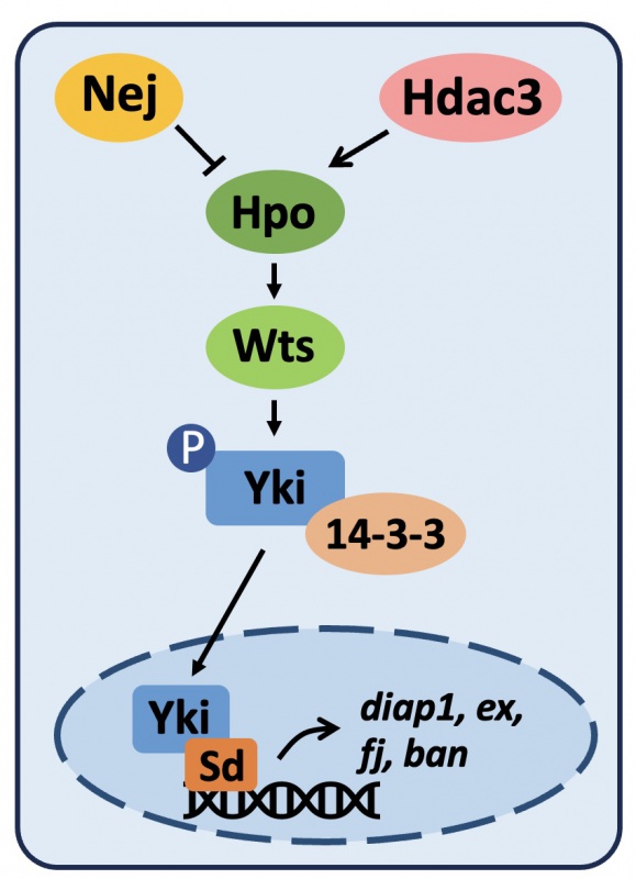 Hippo通路调控细胞增殖和凋亡,调节细胞数量,最终决定器官大小。本研究以经典模式生物果蝇为模型,通过遗传筛选,发现组蛋白去乙酰化酶Hdac3是Hippo信号通路的新型正向调控因子。Hdac3通过其去乙酰化酶活性,在细胞质中直接作用于Hippo通路的核心激酶Hpo,使其去乙酰化从而增强其稳定性。反之,乙酰转移酶Nej则负责催化Hpo的乙酰化,拮抗Hdac3的作用。这种由Nej和Hdac3共同介导的可逆乙酰化修饰,如同一个精细的“分子开关”,动态调控Hpo的蛋白水平及其下游信号输出。